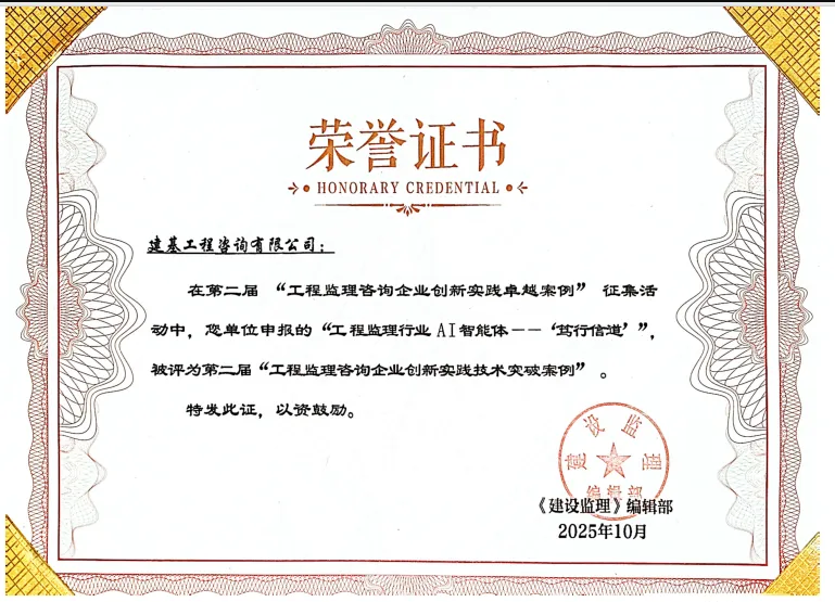 2025年10月30日,2025建設監理創新發展交流會(第十期)在江蘇南京召開。公司《工程監理行業AI智能體——“篤行信道”》案例,斬獲“技術突破案例”獎項,并在會上接受表彰。
